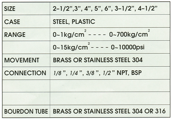 . Generally prssure gauge, compound gauge, vacuum gauge Country of Origin:Taiwan Competitive Advantages:Well and High Quality Control Sales Method:Export ,Manufacture